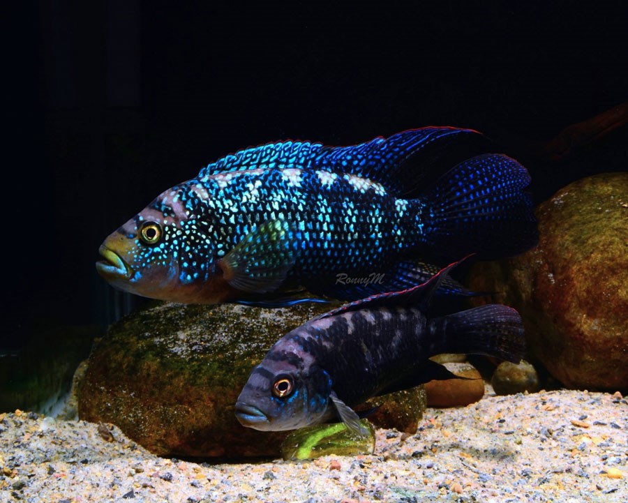 Są to jak widać przepiękne ryby. Pielęgnice Niebieskołuskie dorastają do 20/25 centymetrów długości ciała, żyją około 10 lat. Pielęgnice Pawiookie to bardzo duże ryby, dorastają do 35 centymetrów i żyją do 15 lat. Oba te gatunki są wszystkożerne ale z wiekiem preferują mięso. Bardzo lubię te ryby!